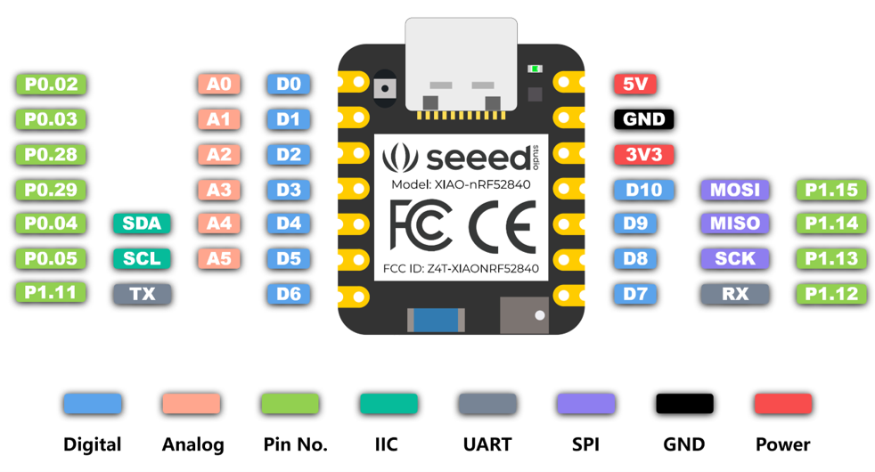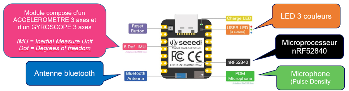 La carte XIAO BLE Sense, développée par la société Seeed est une carte programmable basée sur un microprocesseur nRF52840 possédant des capteurs et autres modules intégrés comme le Bluetooth 5.0 :